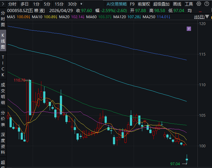 红星资本局4月29日消息,今日早盘,五粮液(000858.SZ)股价跌破100元,截至发稿,报97.6元/股,跌幅达2.59%。