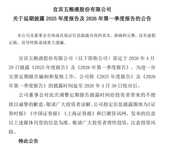 五粮液在公告中表示,公司董事会对此次调整定期报告披露时间给投资者带来的不便致以诚挚的歉意,敬请广大投资者谅解。